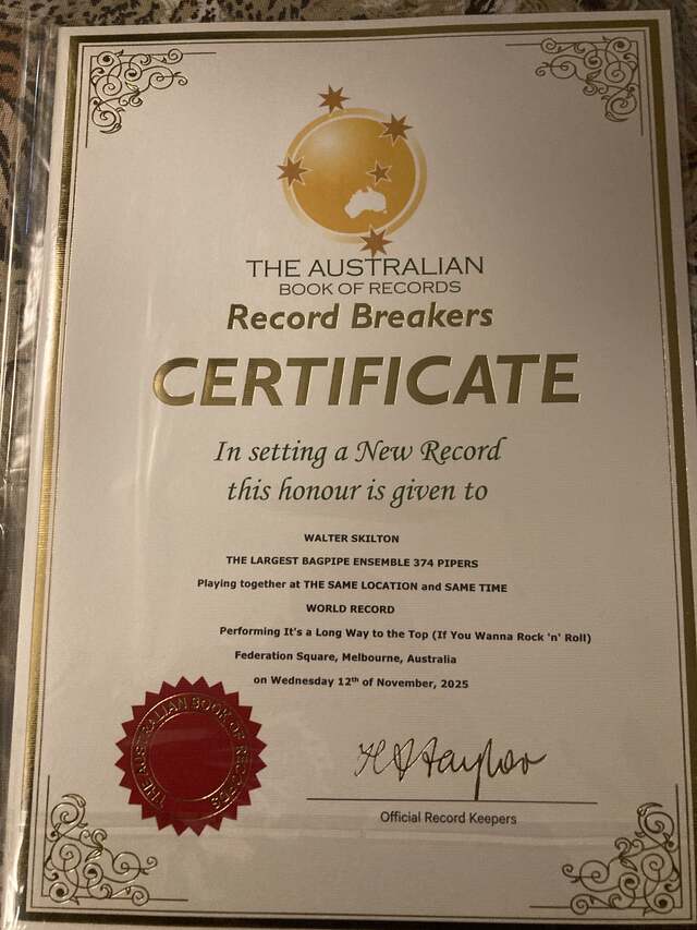 Walter Skilton was one of 374 pipers who descended upon Fed Square in Melbourne on Wednesday 12 November to mark the arrival of AC/DC in the city with a rendition of ‘It’s a Long Way to the Top (If You Wanna Rock ‘n’ Roll)’.